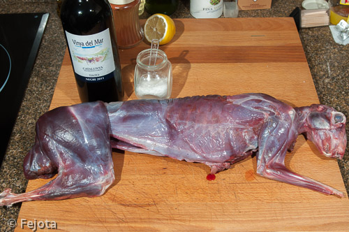 Liebre, vino, cebolla, ajo, tomillo, pimienta, pimiento, tomate y pochas.